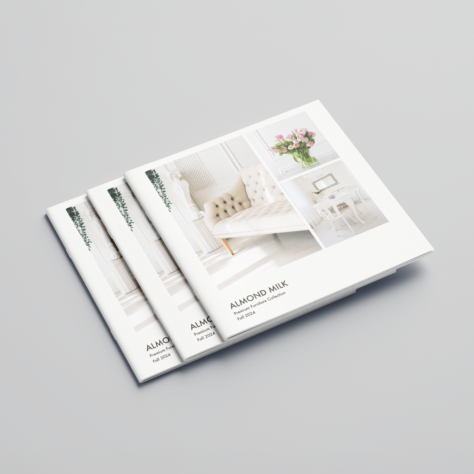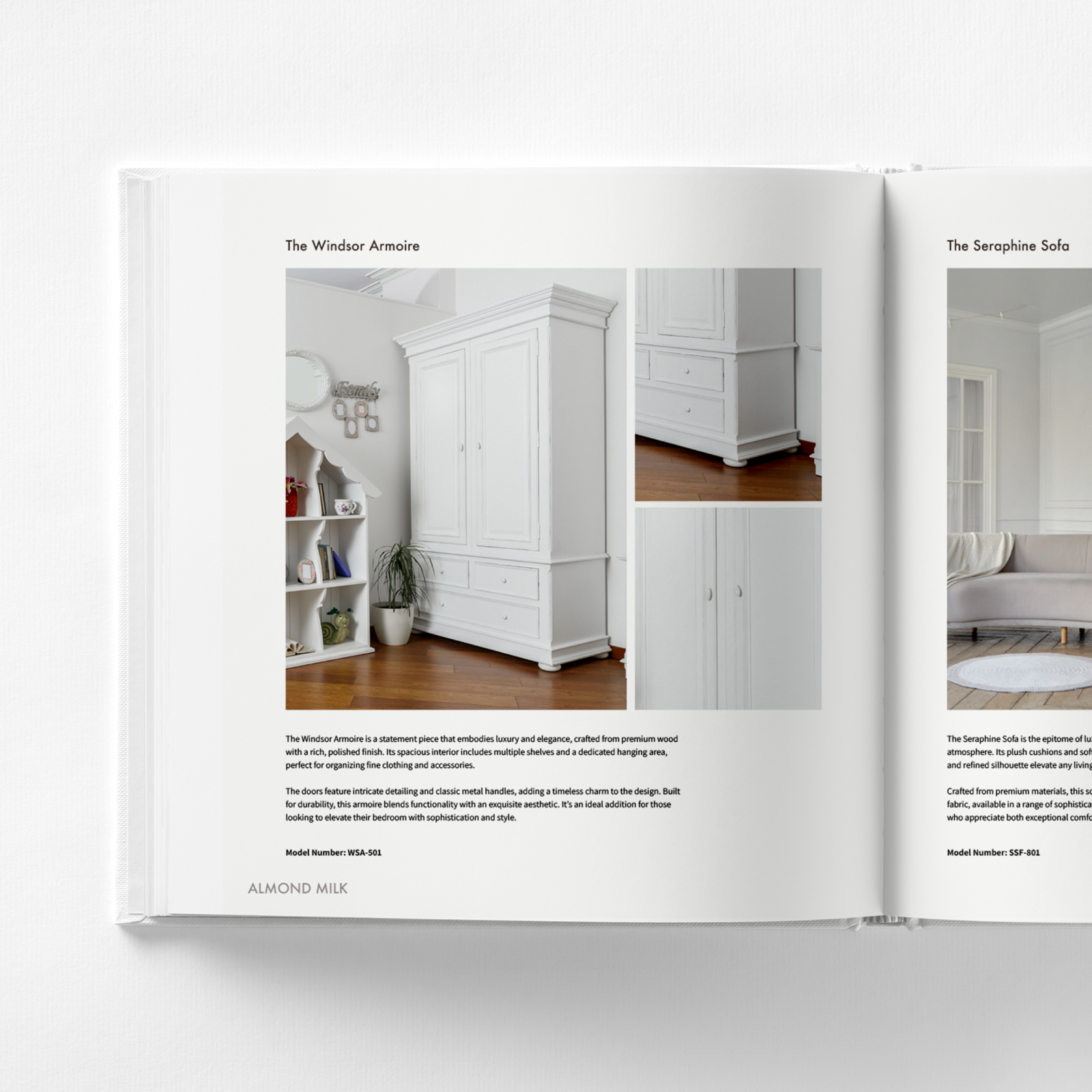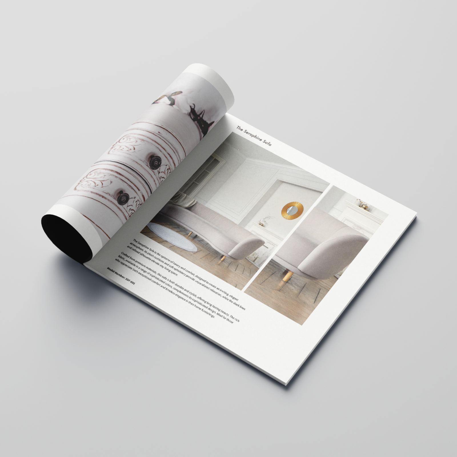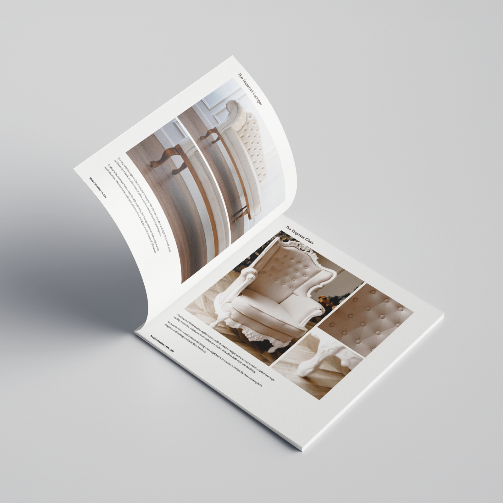 We created a custom designed catalog to showcase their collection available both as a digital file for client communication and as a printed version for display in the showroom. The catalog reflects the brand’s refined aesthetic and highlights the uniqueness of each piece.